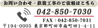 | 職種 | 鉄筋工 ◎未経験者・経験者ともに大歓迎! ◎人間関係もよく、働きやすい! ◆お気軽にご連絡ください!! |